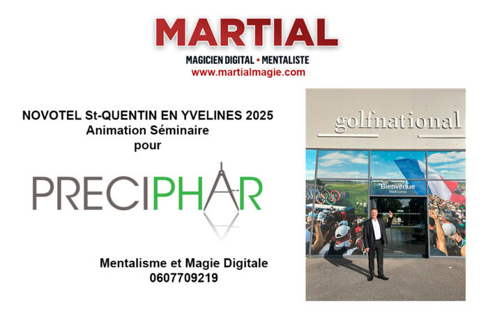 Soirée lors d’un séminaire organisée par PRECIFAR au Novotel de St-Quentin en Yvelines. Animation close-up pour PRECIPHAR à ST-QUENTIN EN YVELINES avec Martial magicien, mentaliste et spécialisé en magie digitale. Martial est intervenu pour une Animations Close-up en faisant participer le public à travers des expériences mêlant la magie, le mentalisme et le digital.