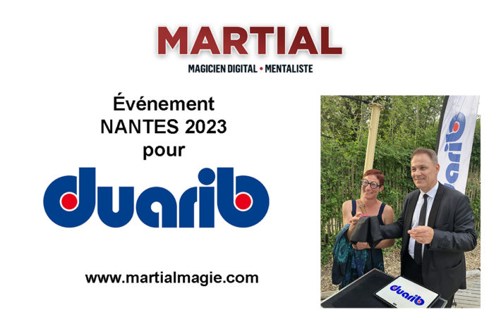 Martial est intervenu lors des 70 ans de la société du Ribes à Saint Philbert de Grand lieu. Les collaborateurs de l’entreprise ont été agréablement, surpris par une magie moderne et innovante. Ainsi martial est passé parmi les groupes lors du cocktail dînatoire pour dynamiser la soirée. Magicien digital pour DUARIB à NANTES pour marquer les esprits lors de cet anniversaire. Magicien numérique et mentaliste, Martial a offert un programme de magie exceptionnel.