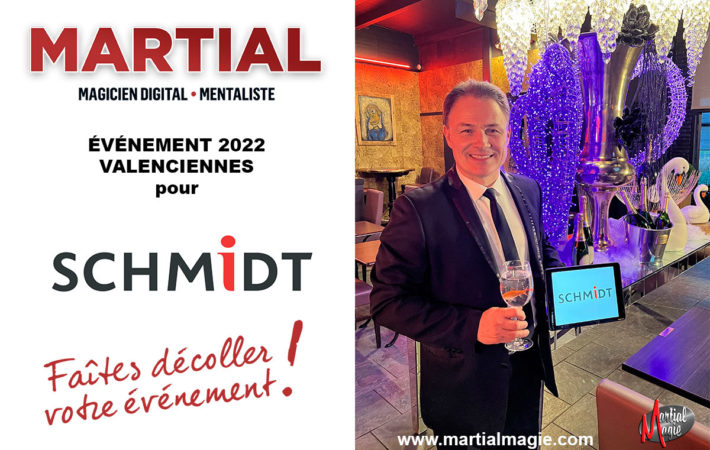Le magicien comme animation est l’idée parfaite pour agrémenter votre événement. Martial fut le Magicien mentaliste à Valenciennes pour SCHMIDT ce 25 février 2022. Il est intervenu parmi les invités lors d’un dîner. Martial magicien close-up a bluffé le public avec sa magie moderne. D’ailleurs il vous propose d’intervenir pour vos prochains événements. Que ce soit pour un congrès un séminaire ou un lancement de produit il vous proposera une prestation adaptée. Par ailleurs il interviendra également sur scène pour un show totalement interactif avec le public.