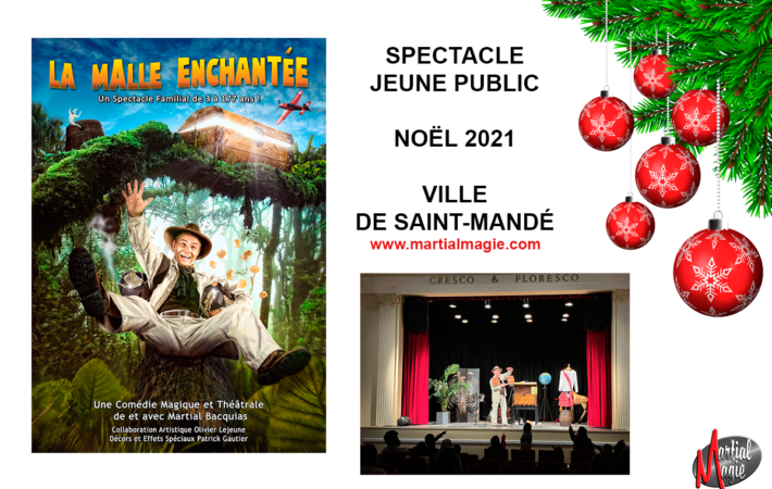C’est à l’hôtel de ville de Saint-Mandé que s’est déroulée l’arbre de Noël 2021. Martial a présenté La Malle Enchantée. Ainsi vous pourrez visionner la vidéo de ce spectacle familial. Magicien pour enfants Arbre de Noël 2021 avec un magicien spécialisé pour les enfants. C’est un spectacle en tournée dans toute la France et présenté lors des saisons culturelles et des festivals jeune public. Ce spectacle pour enfants remporte un gros succès également auprès des adultes qui sont ravis de découvrir la magie de Martial.