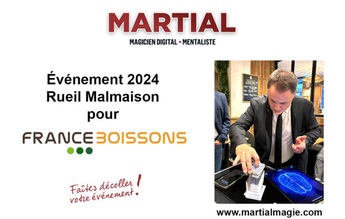 Martial a offert au 50 collaborateur une soirée magique, Magie digitale et mentalisme au programme ! Ainsi, la société FRANCE BOISSONS a choisi un Magicien professionnel pour animer son évènement. Mentaliste pour FRANCE BOISSONS à RUEIL MALMAISON avec un artiste qui présente une magie moderne et innovante.